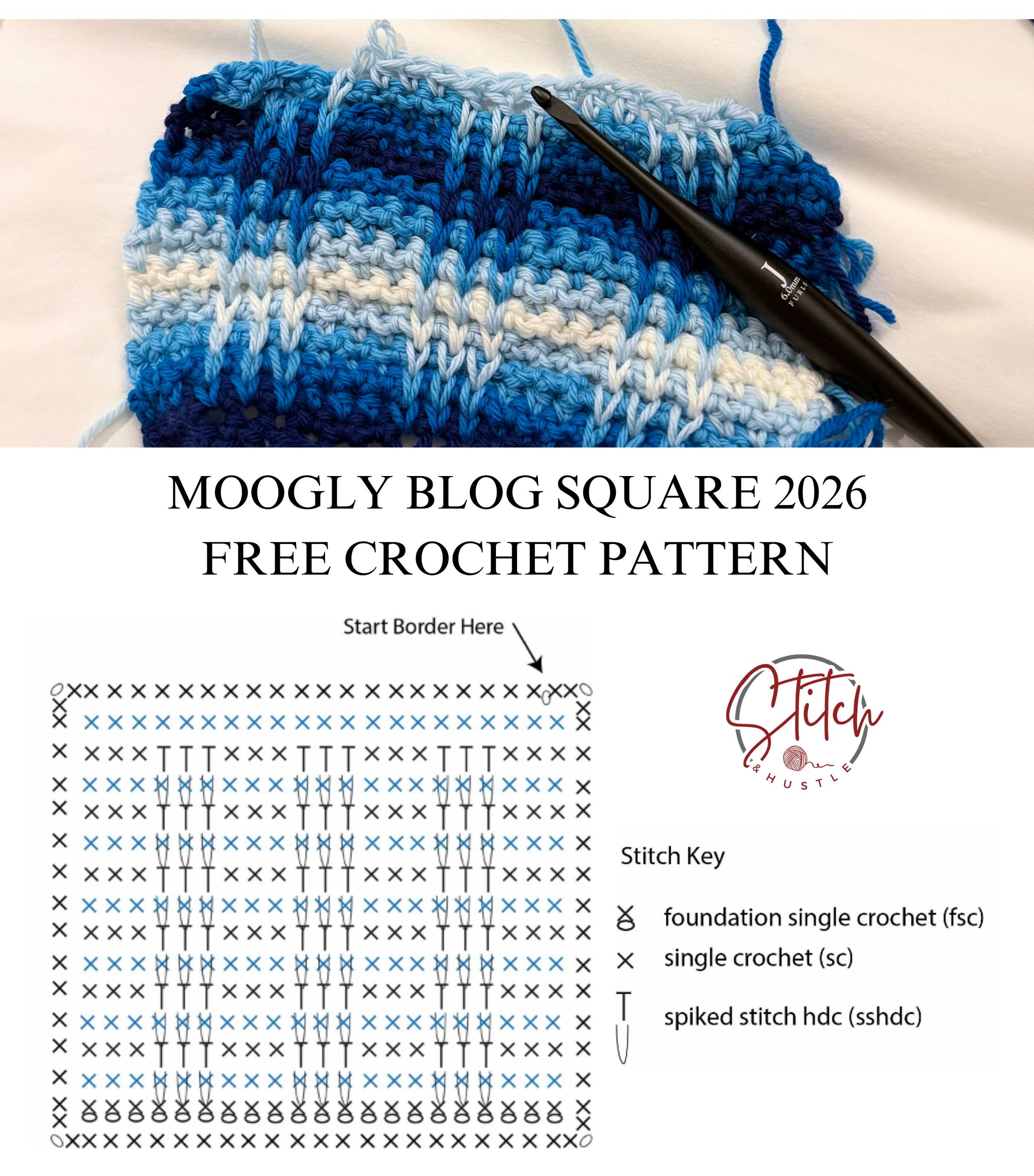 /I am so excited that Stitch & Hustle is part of 2026 Moogly Blanket CAL. It has been my honor to be part of this for several years and it is especially fin to do. This year, my square is a fun flow that I made into a little fade of blues but you can use any colors for contrast and fun.